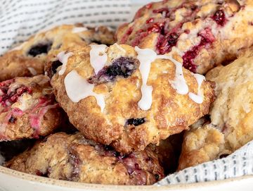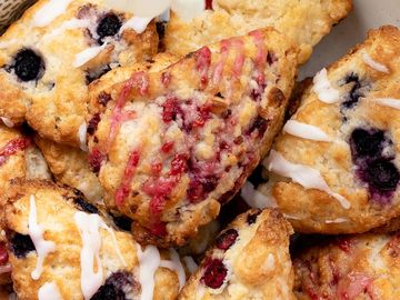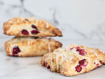 Sixteen mini or eight full size scones packed with raspberries and sweatened with white chocolate