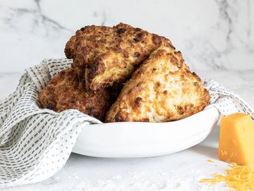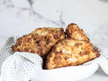 Sixteen mini or eight full size, these savoury scones have a crispy outside with a fluffy centre, topped with malden salt